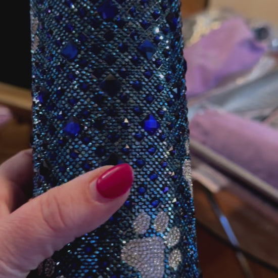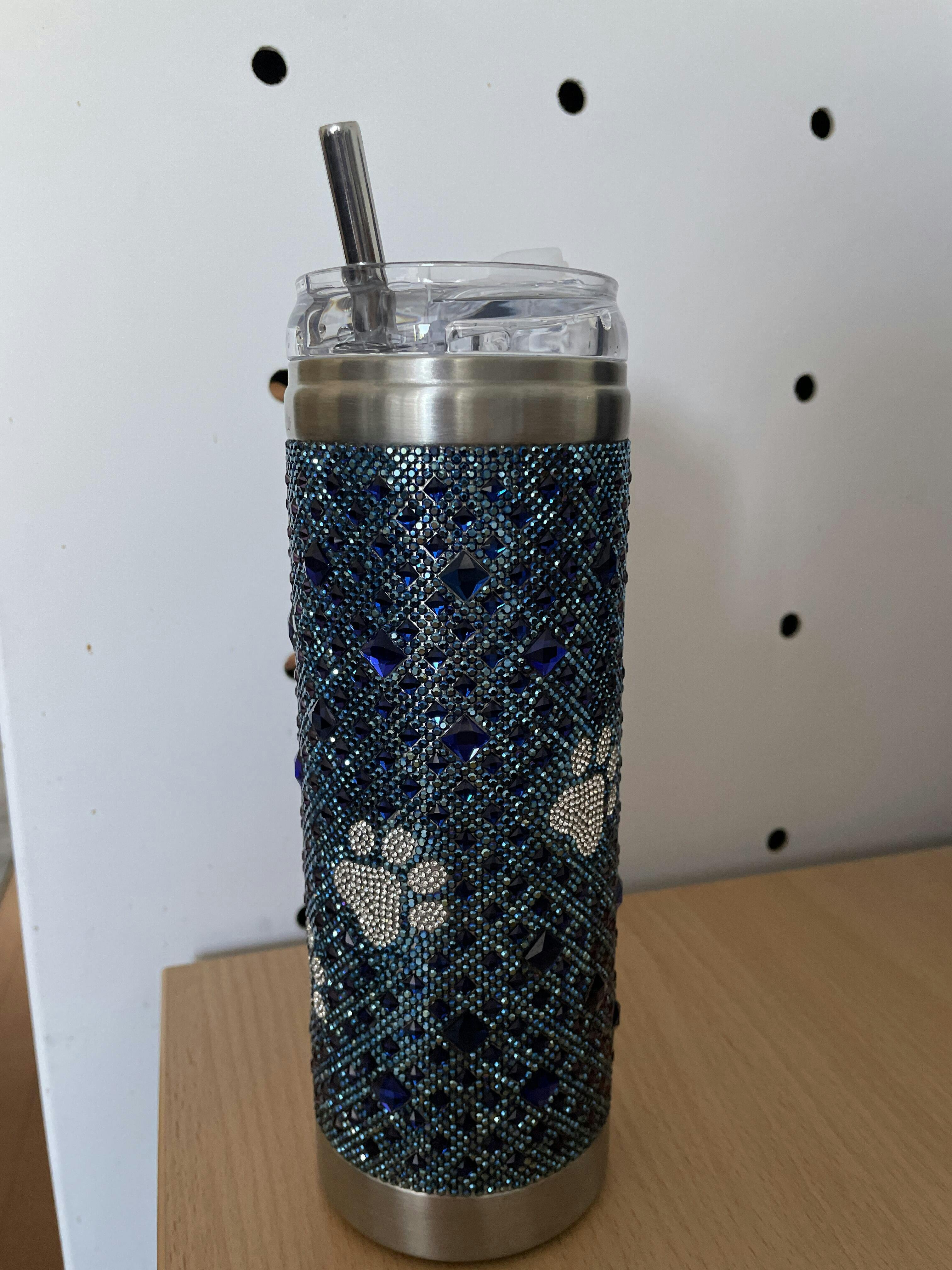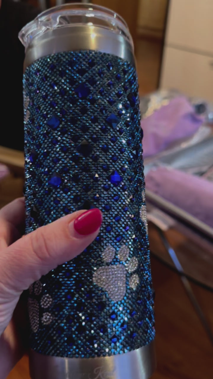 Show off your love for your furry best friend with our stunning navy blue 20oz tumbler featuring shimmering silver paw prints that sparkle with every sip. Wether you are out for a walk or relaxing at home, this double-walled tumbler keeps your drinks hot or cold while adding a touch of canine charm. It's the perfect blend of practical and paw-sitively adorable. Each tumbler comes with a stainless steel straw, twist off cover, and a beautiful velvet gift bag.